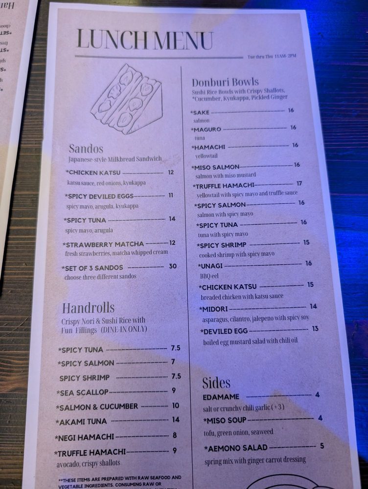 The menu features standout items like the succulent Spicy Tuna Donburi and the Truffle Hamachi Hand Roll, both bursting with fresh flavors and expertly crafted textures. Diners rave about the unique Sandos, including the delectable Chicken Katsu Sando and the creative Spicy Deviled Eggs Sando, each presented as culinary works of art.